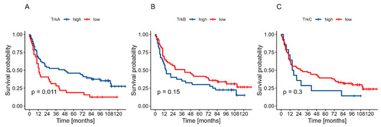Two-year OS in relation to expression levels: (A)—TrkA, (B)—TrkB, (C)—TrkC.