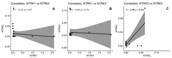 Graphical correlation between mRNA levels of NTRK genes. (A)—Correlation: NTRK1 vs. NTRK2, (B)—Correlation: NTRK1 vs. NTRK3, (C)—Correlation: NTRK1 vs. NTRK2.