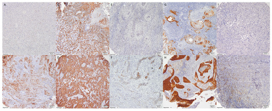 Expression of TrkA in OSCC—membranous and cytoplasmic staining intensity according to H-score: (A). 0, (B). 1, (C). 2, (D). 3, expression of TrkB in OSCC—membranous and cytoplasmic staining intensity according to H-score: (E). 0, (F). 1, (G). 2, (H). 3, expression of TrkC in OSCC—membranous and cytoplasmic staining intensity according to H-score: (I). 0, (J). 1. (magnification: 10×).