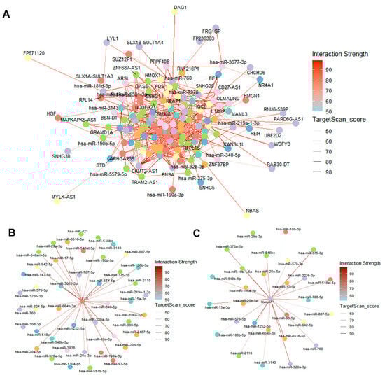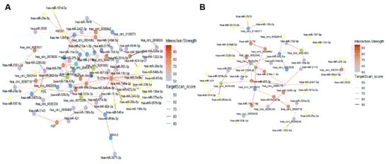 2.7. DE lncRNA/DE circRNA–DE miRNA–DE mRNA Network Construction