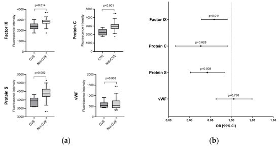 Coagulation protein levels regarding the presence of CVE. (a) Boxplots depicting factor IX, protein C, protein S, and VWF levels in patients with (dark gray) and without (gray) cardiovascular events; (b) Visual representation of adjusted associations between coagulation protein levels after discharge and the occurrence of cardiovascular events. Statistics: Data were calculated using generalized linear models (GLMs) with a binomial distribution. Odds ratio, 95% confidence intervals (lower boundary: 2.5%, upper boundary: 97.5%), and p-value are shown. GLMs were adjusted for age, gender, body mass index (BMI), follow-up time after discharge, and whether the patient received anticoagulant therapy after discharge. Covariates were selected through a stepwise approach based on the Akaike Information Criterion (AIC). Abbreviations: OR, odds ratio; 95%CI, 95% of confidence interval; p, level of significance; VWF, von Willebrand factor; CVE: cardiovascular event.