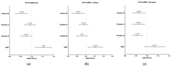 Adjusted associations of coagulation proteins after discharge with NT-proBNP levels for all patients (a), males (b) and females (c). Statistics: Data were calculated using generalized linear models (GLMs) with a gamma distribution. AMR, 95% confidence intervals (lower boundary: 2.5%, upper boundary: 97.5%), and p-values are shown for both adjusted models. GLMs were adjusted for age, gender, body mass index (BMI), follow-up time after discharge, and whether the patient received anticoagulant therapy after discharge. Covariates were selected through a stepwise approach based on the Akaike Information Criterion (AIC). Abbreviations: AMR, arithmetic mean ratio; 95%CI, 95% confidence interval; p, level of significance; VWF, von Willebrand factor.