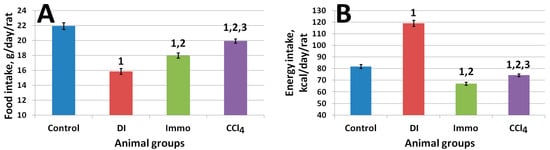 Starting from the 7th day, a significant lag in the body weight gain of Immo group animals was observed compared to the control, DI, and CCl4 animals. The difference remained significant throughout the experiment. The body weight gain of CCl4 animals, starting from day 35, was significantly lower compared to the control until the end of the experiment. The obtained result is consistent with the food intake data. The body weight gain of DI animals did not differ significantly from the control, despite higher calorie consumption.