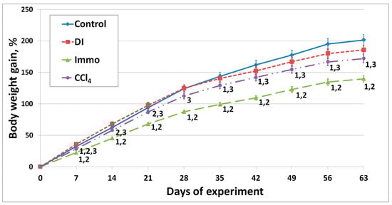 Body weight gain of experimental animals, %. 1 differences are significant against control group; 2 differences are significant against DI group; 3 differences are significant against Immo group; p < 0.05.