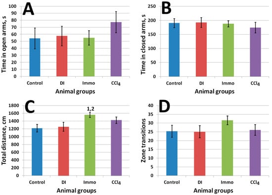 Elevated plus maze test results. 1 differences are significant against control group; 2 differences are significant against DI group; p < 0.05. (A) Time in open arms, s (η2 = 0.04); (B) time in closed arms, s (η2 = 0.02); (C) total distance (η2 = 0.170); (D) zone transition number (η2 = 0.06).