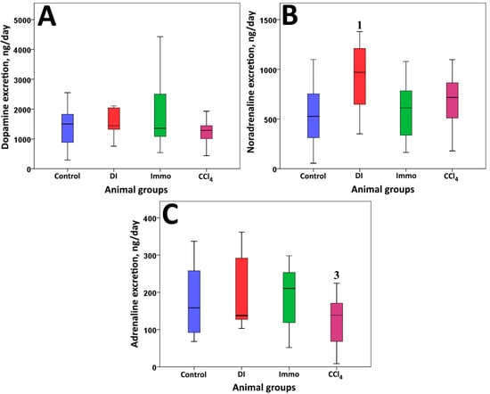 A significant increase in noradrenaline (p = 0.03) was found in the urine of DI animals compared to control animals, while there were no significant differences in other indicators. The obtained result may be a consequence of activation of the sympathicoadrenal system in response to the toxic effects of cholesterol and fructose. Animals of the CCl4 group had a significant decrease (p = 0.04) in the adrenaline level compared to animals of the Immo group.