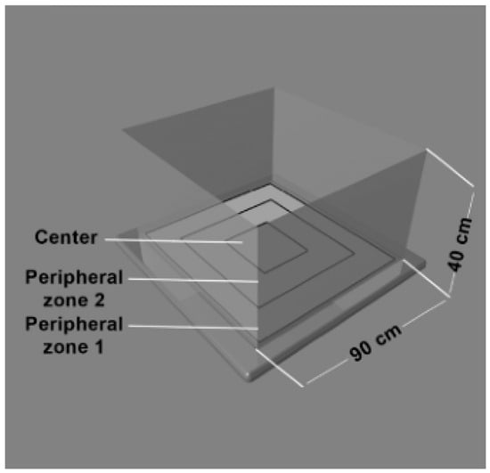 The open field box was a black square arena (90 cm × 90 cm) surrounded by gray walls (40 cm) and divided into one central zone and two peripheral zones (Figure 5).