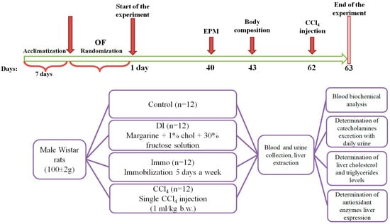 Open Field testing of animals was conducted after seven days acclimatization prior to the start of the experiment. Animals were divided into 4 groups (n = 12) based on body weight and OF test results: control, diet-Induced (DI), Immo, and CCl4. The groups were formed to achieve the same average weight and the same average OF activity of animals between the groups (Table 7).