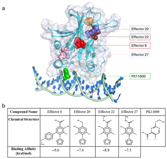 (a) Cartoon representation of Y220C mutant p53-DBD bound to DNA and docked effectors. Docked effector compounds are represented in spheres: PK11000 in green, Effector 8 in red, 20 in violet, 22 in brown, 27 in pink, and the Y220C mutant site represented by an orange mesh. (b) Table displaying structural data of PK11000 and the four effector compounds, along with their respective binding affinity data [], that were identified and allosterically docked to the average global structures of 1 us WT p53 and Y220C p53 simulations sourced from Han et al. [].