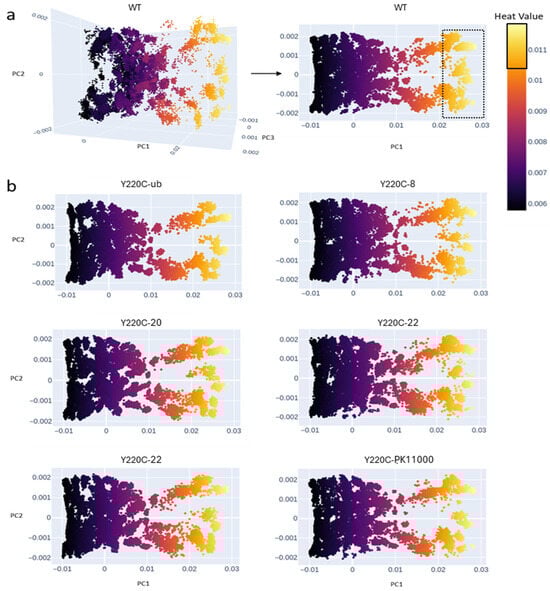 Electrostatic heat kernel principal component (PC) projections of all 193 residues for each of the seven investigated p53 DBD constructs’ 152 sampled frames of simulation. In total, there are 152 × 193 = 29,336 embedded points in R3 principal component space for each construct. (a) The projection of the wild-type construct’s 152 heat kernels in R3 across PC1, PC2, and PC3 (left) and R2 across PC1 and PC2 (right) are displayed. (b) While calculated in R3, the projections of the remaining six constructs: Y220C, Y220C-8, Y220C-20, Y220C-22, Y220C-27, and Y220C-PK11000 are only shown across R2 for clarity. A Y220C construct bound to the effector drug compound j is denoted as Y220C-j. Color mapping indicated by the heat value legend represents the degree of node connectivity in the protein system. The more yellow the node embedding, the higher that node embedding’s degree of connectivity. The solid box on the legend indicates ranges of node embedding connectivity values at or above 0.0105. The dotted box surrounding the WT heat kernel demonstrates how the projection of these corresponding high connectivity values distributes across the latent PC space.