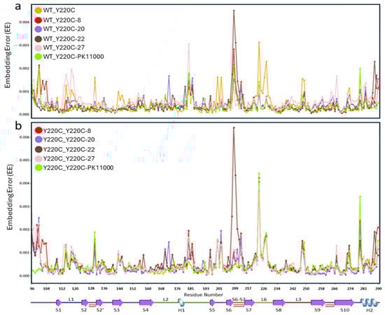 A second set of five EE distributions between the unbound Y220C mutant and each of the mutant effector drug-bound constructs (Y220C-8, Y220C-20, Y220C-22, Y220C-27, and Y220C-PK11000) revealed regions of high EE value overlapping with those found in the distributions between the wild type and the unbound Y220C mutant (Figure 3b). High EE values were consistently identified in the S6-S7 loop (residues N207-R211), particularly at R209. Among the drug-bound constructions, Y220C-22 displayed the highest embedding error values in this region, while Y220C-8 and Y220C-PK11000 exhibited comparatively moderate values, suggesting differential effects of the drug compounds on the electrostatic dynamics of residues in this loop region.