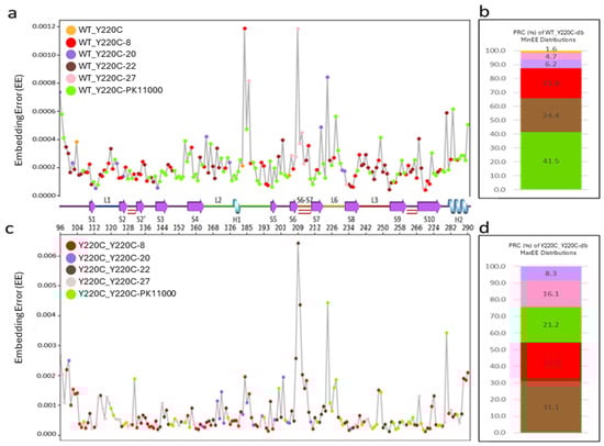 MinEEa (Figure 4a,b) identified residues with the smallest embedding error values across the distributions between the wild type and each of the six Y220C constructors investigated, highlighting regions where drug binding restored wild-type-like dynamics (Figure 4a). The results, shown in Figure 4b, revealed that the Y220C-PK11000 construct accounted for the largest proportion (41.45%) of residues with minimal embedding error values, particularly in regions spanning S3 (residues C141-W146), S4 (residues T155-Y163), L2 (residues S183-L194), and L6 (residues E221-T230). Constructs Y220C-22 and Y220C-8 ranked second and third, with proportions of 24.35% and 21.76%, respectively. Conversely, the unbound Y220C construct exhibited the smallest proportion of residues with minimal embedding errors (1.55%), followed by Y220C-27 (4.66%) and Y220C-20 (6.22%).