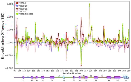 Embedding error difference (EED) distributions for each of the five Y220-db constructs relative to the WT and Y220C constructs across all 193 DBD residues. The X-axis corresponds to the residue index, and the Y-axis corresponds to the EEE value calculated as the difference (error) between each residue’s EE value from the Y220C-ub_Y220C-j and WT_Y220C-j distributions, where j is one of the five examined drug compounds: 8, 20, 22, 27, and PK11000. A blue dotted line is drawn across the x-axis to indicate an EEE value of 0. Secondary structural elements of the p53-DBD are visualized under the x-axis. Coloration as dependent on construct Y220C-j follows from Figure 3.