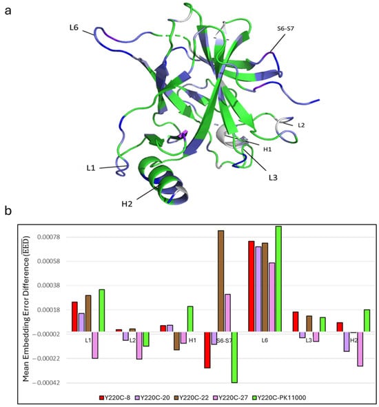 To investigate the role of allosteric rescue in regions critical for DNA binding and overall p53-DBD function, we analyzed the distribution of residues with high embedding error difference (EED) values across key loop and helical motifs, including L1, L2, H1, S6-S7, L6, L3, and H2. These regions were selected due to their functional implications in allosteric signaling and their involvement in stabilizing DNA interactions []. L1 and H2 also showed a higher percentage of residues with positive EED values compared with other regions, such as H1, L2, and L3. This is particularly striking given that L1 and L6 are among the most distal regions from the Y220C mutation site. These findings suggest that allosteric drug binding facilitates coordinated electrostatic network reorganizations that span the DBD, effectively coupling proximal regions like L6 and S6-S7 with distal regions like L1 and H2, which directly interact with DNA.