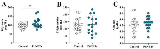 The levels of biochemical markers. In comparison with the controls, patients in the PitNET group presented increased glycemia (A), while there was no statistical significance for the levels of triglycerides (B) and albumin (C). Statistical analysis: Student’s t-test or the Mann–Whitney test was used to compare the groups. p < 0.05 was considered statistically significant. * (p < 0.05).