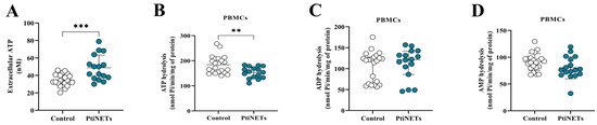 Seeking possible alterations in purinergic signaling, we measured the serum eATP levels, as well as the ectonucleotidase activity in the hydrolysis of nucleotides in PBMCs of both groups (Figure 2A–D). Curiously, we found that the PitNET group had expressively increased levels of eATP (p = 0.0004) in comparison with the control group (Figure 2A). In addition, we also found that the PitNET group presented significantly decreased levels of ATP hydrolysis (p = 0.0039) (Figure 2B), while there were no statistically significant differences between the PitNET and control groups for the hydrolysis of ADP (Figure 2C) and AMP (Figure 2D).
