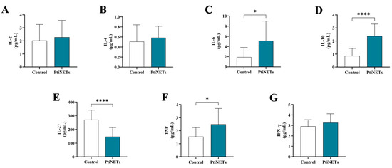 Immunological profiles. The levels of IL-2 (A), IL-4 (B), and IFN-γ (G) were unchanged, while IL-6 (C), IL-10 (D), and TNF (F) were increased in patients with PitNETs. In the case of IL-27, levels were reduced in the PitNET group (E). Statistical analysis: Student’s t-test or the Mann–Whitney test was used to compare the groups. p < 0.05 was considered statistically significant. * (p < 0.05); **** (p < 0.0001).