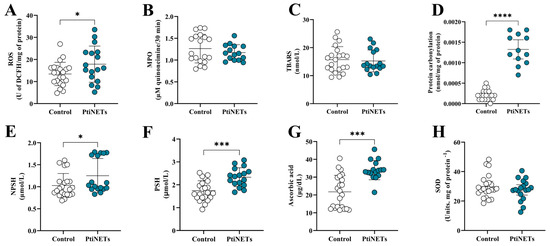 The redox profiles of the enrolled subjects are shown in Figure 4A–H. The PitNET group had increased levels of ROS (p = 0.0466) in comparison with the control group (Figure 4A). Similarly, patients in the PitNET group also presented high levels of protein carbonylation (p < 0.0001) (Figure 4D). However, there was no statistical significance for the pro-oxidant marker levels of MPO (Figure 4B) and TBARS (Figure 4C). Regarding the antioxidant panorama, compared with the controls, we found elevated levels of NPSH (p = 0.0411) (Figure 4E), PSH (p = 0.0001) (Figure 4F), and ascorbic acid (p = 0.0001) (Figure 4G). We did not find statistical differences in the levels of SOD in the comparison of the control versus PitNET groups (Figure 4H).