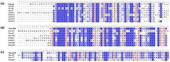 Alignment of amino acid propeptide sequences of H. medicinalis (NCBI BioProject PRJNA257563) AMPs of (a) lumbricin, (b) neuromacin and (c) theromacin. LBrHM1, LBrHM11, LBrHM12, LBrHM13, LBrHM14—lumbricin homologues; NrlHM1, NrlHM2, NrmHM1, NrmHM2—neuromacin homologues; ThmHM1—theromacin homologue; LBr-HM—lumbricin (UniProt ID A8V0C6); LBr-LR—lumbricin I (UniProt ID O96447); LBr-MG—lumbricin-PG (UniProt ID A0A288W7G5); LBr-EA—lumbricin (UniProt ID P86929); Nrm-HM—neuromacin (UniProt ID A8V0B3); Nrm-AC—neuromacin-like protein (UniProt ID A5GZY1); Nrm-EF—neuromacin (UniProt ID A0A0M3WPR3); Hmc-HN—hirudomacin (UniProt ID A0A481Y7W7); Thm-HM—theromacin (UniProt ID A8I0L8); Th-HV—theromacin-like protein (UniProt ID A0A0N7Z9P3); Th-TT—theromacin (UniProt ID Q6T6C2). *—Reference sequence. The blue colour gradient reflects the percentage of matching residues at each position: the darker the shade, the higher the degree of conservation and matching of amino acids at a given position. Proline and cysteine residues in patterns are highlighted in red.