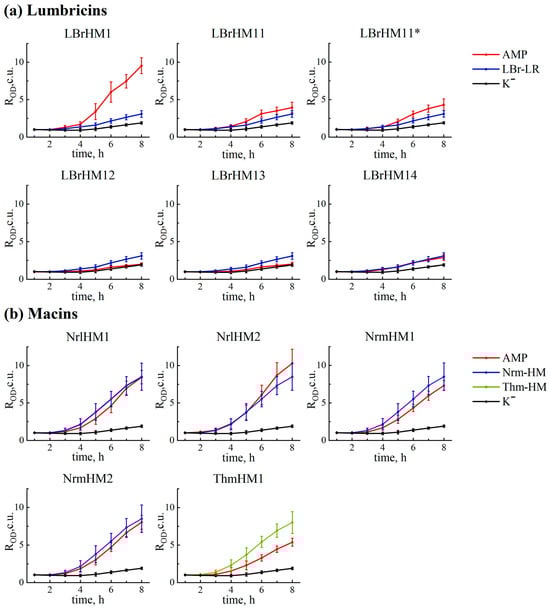 Growth curves of E. coli BL21-Gold (DE3) bacterial culture transformed with expression pET-22b(+) plasmids encoding antimicrobial peptides with the PelB signal peptide: (a) lumbricins, (b) macins. Average optical density ratio for each peptide, calculated as ROD = OD600(-IPTG)/OD600(+IPTG), accompanied by standard deviations. OD600(+IPTG)—optical density value of bacterial culture grown in a medium with 0.1 mM IPTG inducer; OD600(-IPTG)—optical density without transcription inducer. Measurements were taken for sixteen clones every hour. Lines designated as AMP correspond to LBrHM1, LBrHM11, LBrHM12, LBrHM13 and LBrHM14—lumbricin homologues; NrlHM1, NrlHM2, NrmHM1 and NrmHM2—neuromacin homologues; and ThmHM1—theromacin homologue. LBr-LR—lumbricin I (UniProt ID O96447); Nrm-HM—neuromacin (UniProt ID A8V0B3); Thm-HM—theromacin (UniProt ID A8I0L8). K−—pET-min.
