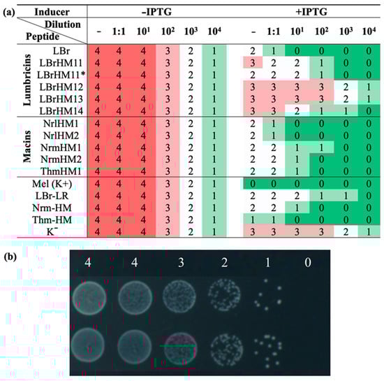 Growth assessment of serial dilution of bacterial cultures expressing antimicrobial peptides on LB agar after 22 h incubation at 37 °C. E. coli BL21-Gold (DE3) were transformed with expression plasmids pET-22b(+) encoding antimicrobial peptides: LBrHM1, LBrHM11, LBrHM12, LBrHM13, LBrHM14—lumbricin homologues; NrlHM1, NrlHM2, NrmHM1, NrmHM2—neuromacin homologues; ThmHM1—theromacin homologue; LBr-LR—lumbricin I (UniProt ID O96447); Nrm-HM—neuromacin (UniProt ID A8V0B3); Thm-HM—theromacin (UniProt ID A8I0L8); Mel(K+)—melittin; K−—pET-min. (a) Digital interpretation of antimicrobial activity analysis on agar. The mode is based on the results of eight experimental replicates and two biological replicates. The values correspond to serial dilutions (no dilution, 1:1, from 101 to 104) on agar medium: −IPTG—without transcription inducer, +IPTG—with the addition of IPTG inducer up to 0.1 mM. Bacterial growth was estimated as follows: (4) a uniform bacterial layer, (3) minor gaps within the bacterial layer, (2) overlapping colonies, (1) single, separately located colonies and (0) no visible colonies. (b) Example of drop-plating serial dilution of E. coli culture and interpretation of the bacterial growth.