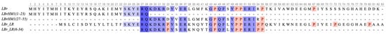 Alignment of lumbricin amino acid sequences. LBrHM1: full-length lumbricin sequence found in the H. medicinalis genome; LBrHM1(1–23)—N-terminal fragment; LBrHM1(27–55)—fragment corresponding to the propeptide form of lumbricin I (6–34) []; LBr-LR—lumbricin previously identified in L. rubellus (UniProt ID O96447); LBr-LR(6–34)—a section from 6 to 34 residues of the mature peptide lumbricin I. The blue colour gradient reflects the percentage of matching residues at each position: the darker the shade, the higher the degree of conservation and matching of amino acids at a given position. Proline residues are highlighted in red.