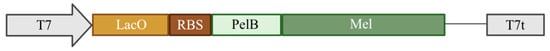 Schematic of the cloning/expression region of the plasmid vector pET-22b(+)—with an insert encoding an antimicrobial peptide. T7—T7 promoter, LacO—lac operator, RBS—ribosome binding site, PelB—signal peptide, Mel—sequence encoding melittin, T7t—T7 terminator.