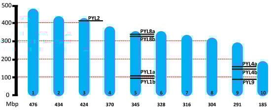 - Gonzalez-Guzman, M.; Rodriguez, L.; Lorenzo-Orts, L.; Pons, C.; Sarrion-Perdigones, A.; Fernandez, M.A.; Peirats-Llobet, M.; Forment, J.; Moreno-Alvero, M.; Cutler, S.R.; et al. Tomato PYR/PYL/RCAR abscisic acid receptors show high expression in root, differential sensitivity to the abscisic acid agonist quinabactin, and the capability to enhance plant drought resistance. J. Exp. Bot. 2014, 65, 4451–4464. [Google Scholar] [CrossRef]