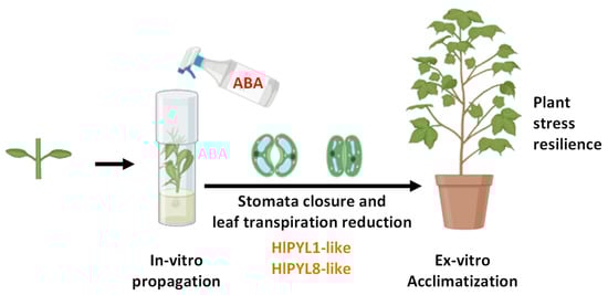 Di Sario, L.; Navarro-Payá, D.; Zubillaga, M.F.; Matus, J.T.; Boeri, P.A.; Pizzio, G.A. Abscisic Acid Enhances Ex Vitro Acclimatization Performance in Hop (Humulus lupulus L.). Int. J. Mol. Sci. 2025, 26, 6923. https://doi.org/10.3390/ijms26146923
