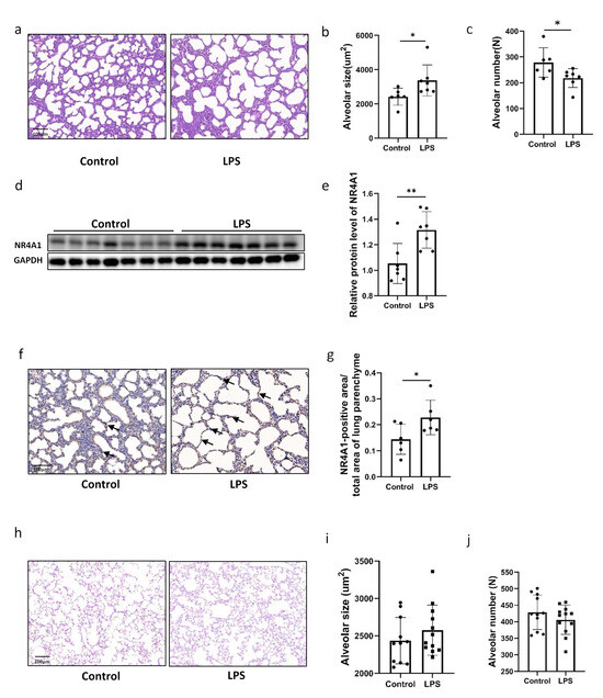 An effective model of intrauterine inflammation was established by intraperitoneally injecting LPS into dams at E12.5. Histological examination of lung tissues at PND1 revealed enlarged alveoli and a decreased number of alveolar structures in neonatal mice exposed to intrauterine inflammation when compared with those in the control group (Figure 1a–c). Western Blot analysis showed significant upregulation of NR4A1 protein expression in the lungs of neonatal mice exposed to intrauterine inflammation when compared to that in the control group (Figure 1d,e). Immunohistochemistry analysis showed an increase in the density of NR4A1-positive areas in the pulmonary epithelial cells of neonatal mice with intrauterine inflammation when compared to that in the control group (Figure 1f,g). However, in offspring with intrauterine inflammation at PND90, no significant difference in the number of alveoli or the size of the alveolar space was observed when compared to those in the control group mice (Figure 1h–j).
