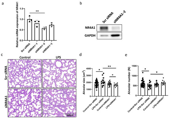 To confirm the role of NR4A1 in offspring lung injury induced by intrauterine inflammation, we treated the mice with siRNA of NR4A1. NR4A1 expression significantly decreased at the mRNA and protein level in the lung tissues treated with si-Nr4a1-2 when compared to those in the scrambled siRNA group (Figure 2a,b). Accordingly, histological examination showed that the inhibition of NR4A1 by intranasally administered si-Nr4a1-2 in offspring reversed intrauterine inflammation-induced impaired alveolarization, as indicated by decreased alveolar size and increased alveolar count (Figure 2d,e) in the lungs of neonatal mice with intrauterine inflammation when compared to those in the scrambled siRNA group.