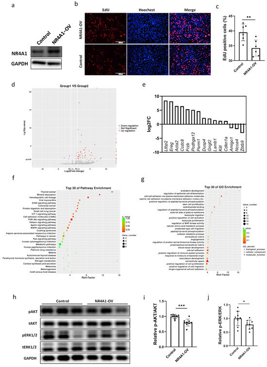 Differential transcriptome and proliferation caused by overexpression of NR4A1 in MLE-12 cells. The efficiency of NR4A1 overexpression was evaluated by Western blot (a). (b) Representative images of EdU-positive cells in NR4A1-overexpressing and control MLE-12 cells (n = 6). (c) The quantification of EdU-positive cells for (b). (d) A volcano plot of DEGs in MLE-12 cells overexpressing NR4A1. (e) The top 15 DEGs associated with lung injury induced by NR4A1 overexpression. (f,g) The DEGs significantly regulated by NR4A1 overexpression are enriched in the top 30 KEGG and GO pathways. (h) Western Blot analysis of whole-cell lysates prepared from NR4A1-overexpressing and control MLE-12 cells after transfection with the vectors for 48 h. The relative protein level of pERK1/2/tERK1/2 (i) and pAKT/tAKT (j) were quantified for (h), with GAPDH used as the loading control (n = 9). All data are presented as the mean ± SD. Statistical analysis was performed using unpaired Student’s t test. * p < 0.05, ** p < 0.01, and *** p < 0.001 as indicated. DAPI: 4′,6-diamidino-2-phenylindole; EdU: 5-ethynyl-2-deoxyuridine; DEGs: differentially expressed genes.