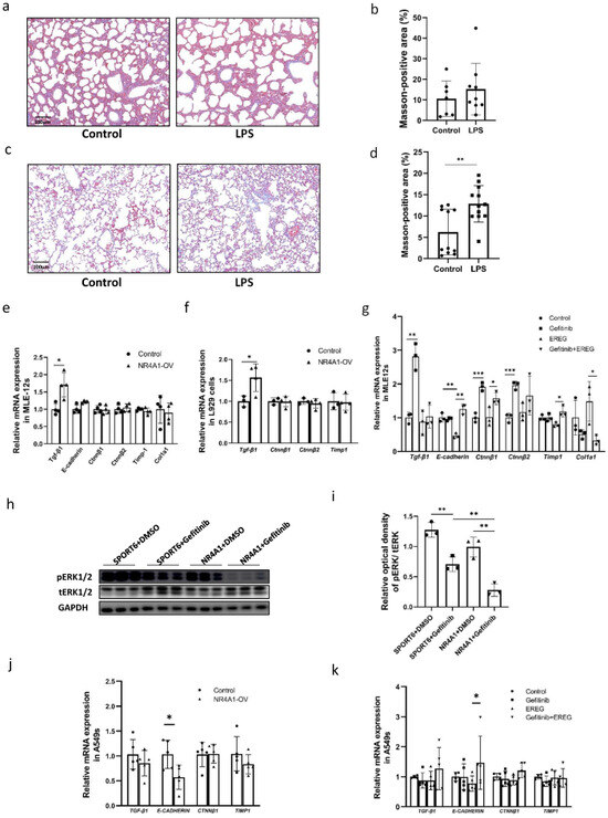 EREG reduced the mRNA expression of E-cadherin in MLE-12 cells, which was reversed by treatment with gefitinib, an EGFR antagonist. The mRNA expression of Ctnnβ1 was increased, while Col1a1 was decreased following gefitinib treatment when compared to the group treated with EREG (Figure 5g). Western Blot analysis demonstrated that gefitinib effectively inhibited the phosphorylation level of ERK1/2 in MLE-12 cells overexpressing NR4A1 (Figure 5h,i).