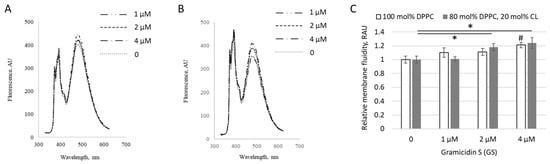 Figure 1B), indicating perturbation of the hydrophobic region of the lipid bilayer by GS molecules. The changes were more pronounced in liposomes containing CL, increasing significantly by 24 ± 8%, likely due to the negative charges of CL, which enhanced interactions with the positively charged ornithine groups in GS.