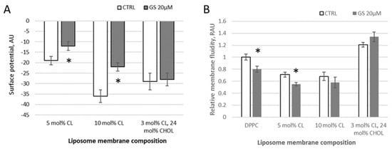 Figure 2A). According to the data of fluorescence spectroscopy, calculations of the surface potential of model membranes were made. When 20 μM GS was bound to the membranes, significant changes of 37 ± 15% (surface potential absolute value was changed from −19.1 to −12.2 units) and 39 ± 12% (from −36.2 to 22.1 units) in the surface potential were observed in liposomal samples with a cardiolipin content of 5% and 10%, respectively (
