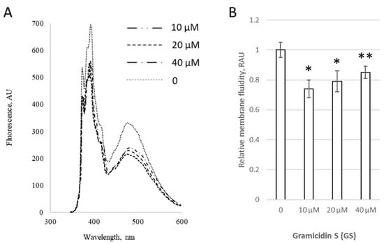 Figure 2B). This reduction in the pyrene signal, corresponding to an increase in membrane micro-viscosity, was similar to the effect observed at lower GS concentrations (1–4 μM) (