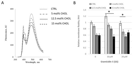 Figure 4). When CHOL content increased in “low concentration range” from 0 to 15%, moderate GS concentration 10 μM led to a decrease in the pyrene signal, resulting in an increase in bilayer microviscosity (