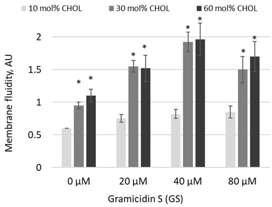 Figure 5). The maximum increase in membrane fluidity was observed with a combination of 30 and 60 mol% CHOL and 40 μM GS (