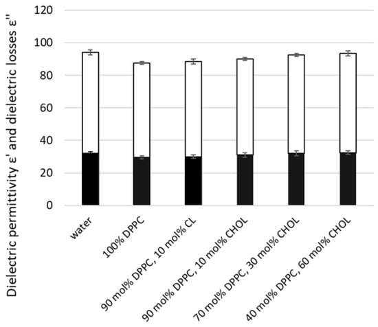 Figure 6). The lowest dielectric permittivity and losses values were characteristic of PC liposomes. The addition of CL or CHOL slightly increases the dielectric parameters of liposome suspensions, with a greater effect as the CHOL fraction rises. This indicates an increase in the amount of free water in the suspensions, which may result from liposome dehydration.
