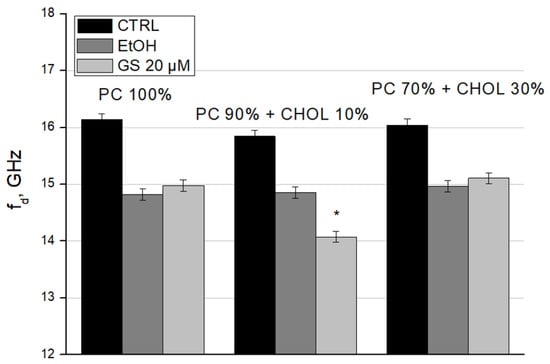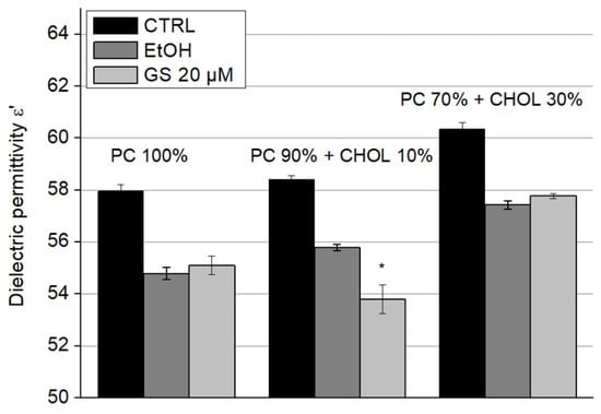 Figure 8. Since these parameters were sensitive to ethanol, in which GS was dissolved—even at low concentrations—its influence on the dielectric properties of the samples was accounted for by separately adding ethanol to the liposome suspensions at concentrations corresponding to those of diluted GS. A significant decrease of 5.5 ± 1% in dielectric permittivity (ε′) due to GS was observed only in liposomes containing 10 mol% CHOL (