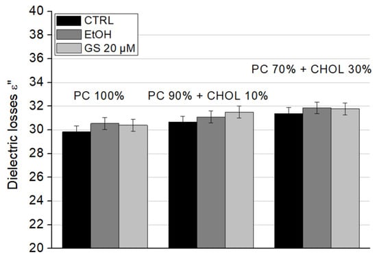 The dielectric losses (ε″) showed a slight increase due to GS; however, this change was not significant for any liposome type (