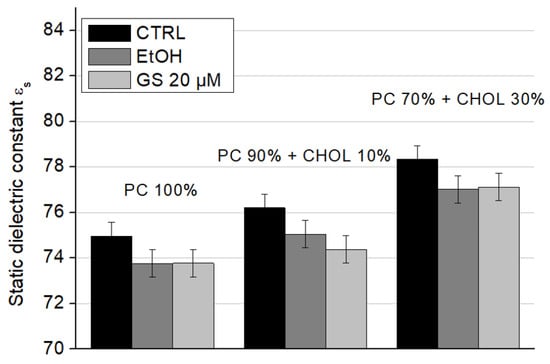 Figure 10, white columns). The addition of ethanol and GS does not change this trend due to CHOL. However, ethanol itself reduces the static dielectric constant approximately by 1–2 units in all conditions. At a concentration of 20 µM, GS slightly decreased the static dielectric constant of liposomes containing 10 mol% CHOL compared to the ethanol control (