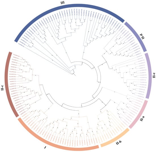 The identified 96 WRKY genes of barley landraces together with the 75 WRKY genes from A. thaliana were used for phylogenetic analysis, and an unrooted maximum-likelihood phylogenetic tree was generated (Figure 1). The sequences were gathered into three groups (I, II and III). In Group I, 18 HvLWRKYs contained two C2H2-type WRKY domains. A total of 43 HvLWRKYs were assigned to Group II with a single C2H2-type domain. The remaining 35 WRKYs were gathered into Group III, which contains the C2HC-type WRKY domain. The WRKYs within Group II were further classified into five subgroups—II-a, II-b, II-c, II-d and II-e—according to the conserved sequences of amino acid other than in WRKY domains.