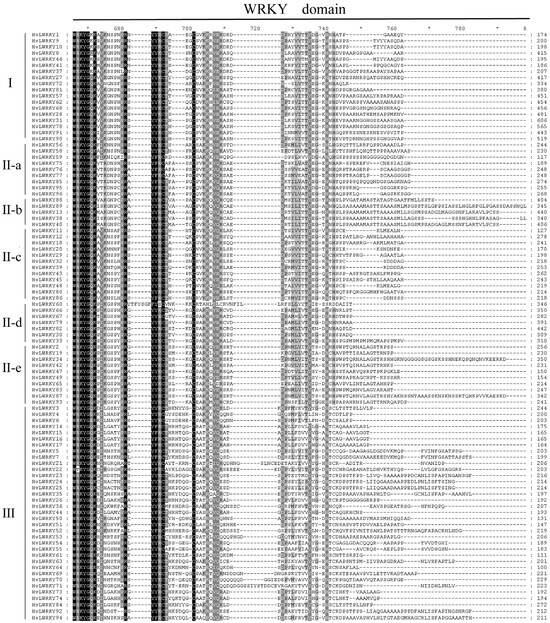 To explore the evolution relationship among HvLWRKY genes, we selected all WRKY domains for multiple sequence alignment (Figure 2). A highly conserved WRKY motif was present in the HvLWRKYs. Meanwhile, various other WRKY domains were also observed, including WRKYGEK, WRKYGKK, WKKYGQK, and WTKYGQK, which were mainly found in Groups I, II-a, and III. For example, in Group I, the domains of HvLWRKY1, HvLWRKY9, HvLWRKY10, HvLWRKY37, HvLWRKY41 and HvLWRKY46 were mutated to WRKYGKK, while the domain of the others was WTKYGQK. The R in the domain of HvLWRKY22 was mutated to T, forming the WTKYGQK heptapeptide structural domain. The R in the domains of HvLWRKY52 and HvLWRKY59 mutated to K, forming the WKKYGQK heptapeptide structural domain. The Q in the domains of HvLWRKY4, HvLWRKY6, HvLWRKY61 and HvLWRKY64 mutated to E, forming the WRKYGEK heptapeptide structural domain. Although WRKYGQK heptapeptide sequences were conserved among HvLWRKYs, low sequence similarity was found outside the structural domain.