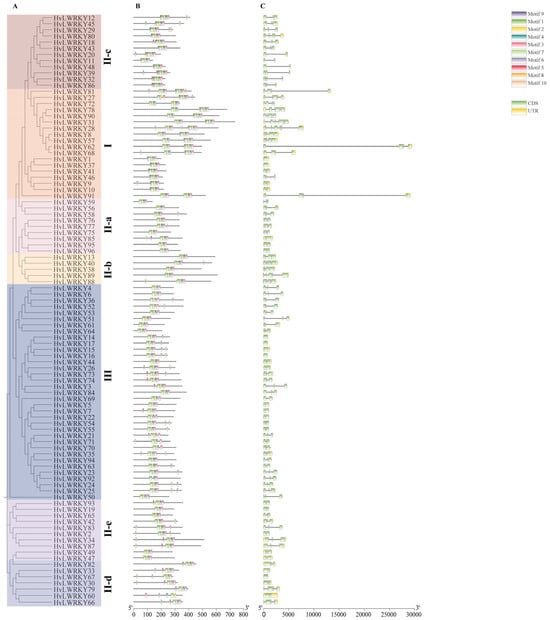 Phylogenetic relationships, conserved motifs, and gene structural analyses of the HvLWRKYs. (A) Neighbor-joining phylogenetic tree of the HvLWRKYs. (B) Conserved motifs in the HvLWRKYs proteins. The 10 predicted motifs are represented by different colored boxes. (C) Gene structure of the HvLWRKYs, and the black line represents an intron.