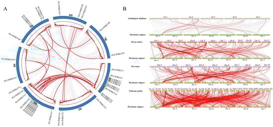 Synteny relationships of HvLWRKY genes. (A) Duplication events among HvLWRKY genes. Gray lines represent all collinear segments and red lines represent duplicated gene pairs. (B) Synteny analyses of WRKY genes between barley and four representative species. Gray lines represent the collinear regions within barley and other species, and red lines indicate the syntenic gene pairs.