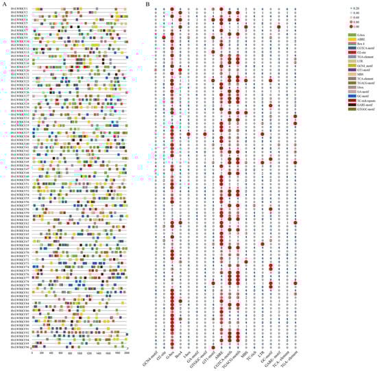 Cis-elements in the promoters of HvLWRKY genes. (A) Different colors of the box indicate different cis-acting elements. (B) Different numbers represent the number of cis-acting elements in each HvLWRKY gene.