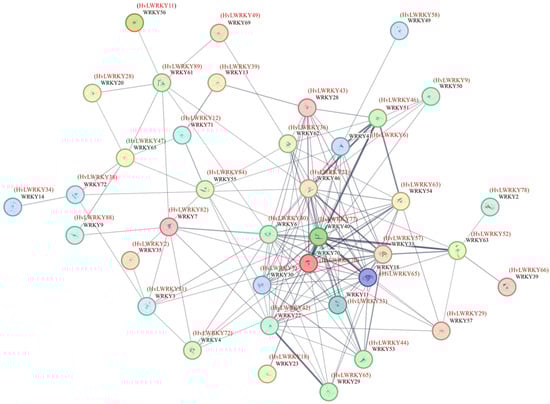 The HvLWRKY sequences were uploaded to STRING database (https://cn.string-db.org, accessed on 15 August 2024) [], and the WRKY sequences of A. thaliana served as a reference for analyzing protein–protein interactions.