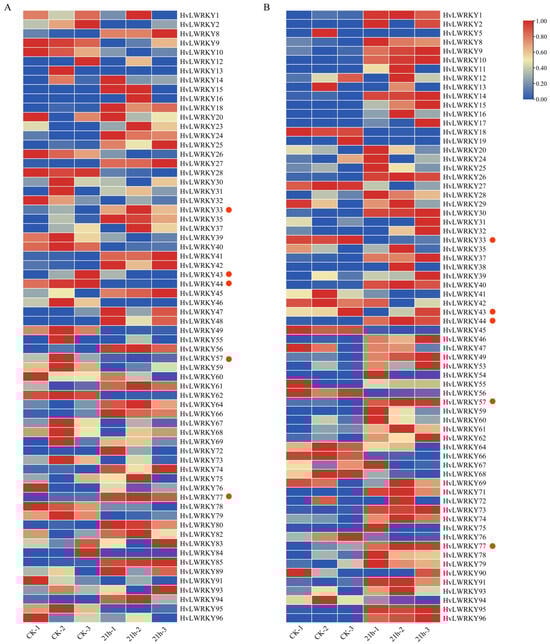 Expression profiles of HvLWRKY genes in barley landraces under cold stress. (A) Cold-sensitive landrace. (B) Cold-tolerant landrace. Red blocks indicate high expression levels, and blue blocks indicate low expression levels. CK denotes the control group, and 21 h represents the duration of cold stress treatment. Red dots represent the genes that primarily interact with Arabidopsis thaliana.