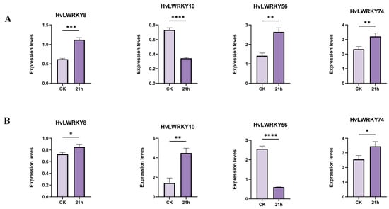Expression patterns of HvLWRKY genes analyzed by qRT-PCR. (A) Different genes from cold-sensitive landrace. (B) Different genes from cold-tolerant landrace. Vertical bars indicate the mean ± SD value. Statistical comparisons are conducted using one-way analysis of variance (ANOVA) for each variable (**** p < 0.0001, *** p < 0.001, ** p < 0.01, * p < 0.05).